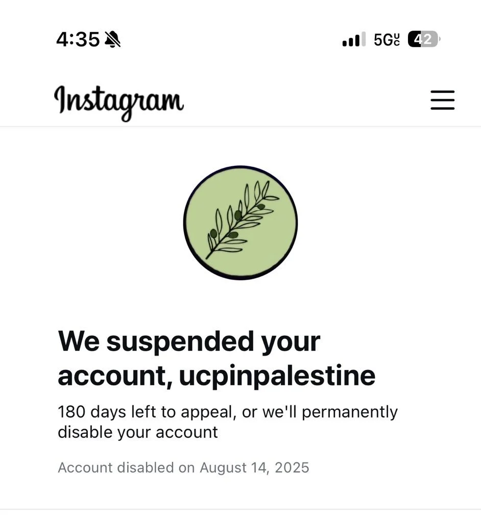 Early in the morning on August 15th, our team woke up to the message that the UCP in Palestine Instagram had been suspended. The message from Meta explained that the UCP in Palestine Instagram “didn’t follow our rules.”